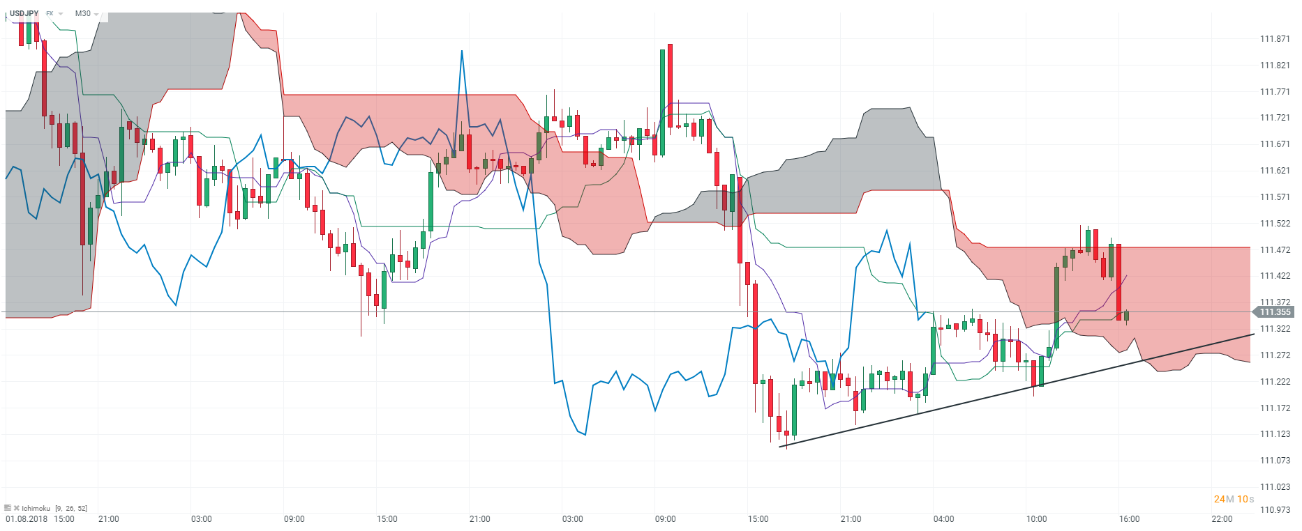 Sur le plan technique, la paire USDJPY évolue sans tendance en unité de temps 30 minutes (M30). En effet, nous observons sur le graphique ci-dessus que les prix fluctuent à l’intérieur du nuage Kumo. Par ailleurs, nous remarquons que les cours fluctuent entre la Kijun (courbe verte) et la Tenkan (courbe mauve). En dépit de l’hésitation des opérateurs, nous remarquons que les prix sont soutenus par un support oblique. Evidemment, nous ne pouvons pas ignorer les velléités acheteuses sur la paire USDJPY car les positions spéculatives baissières sur les obligations de maturité 5 et 10 ans ont battu un nouveau record, selon le dernier rapport de la CFTC. Dans ce contexte, nous avons un biais acheteur sur la paire USDJPY et pensons que l’actif devrait renouer avec le niveau des 111,50 ¥ à court terme.