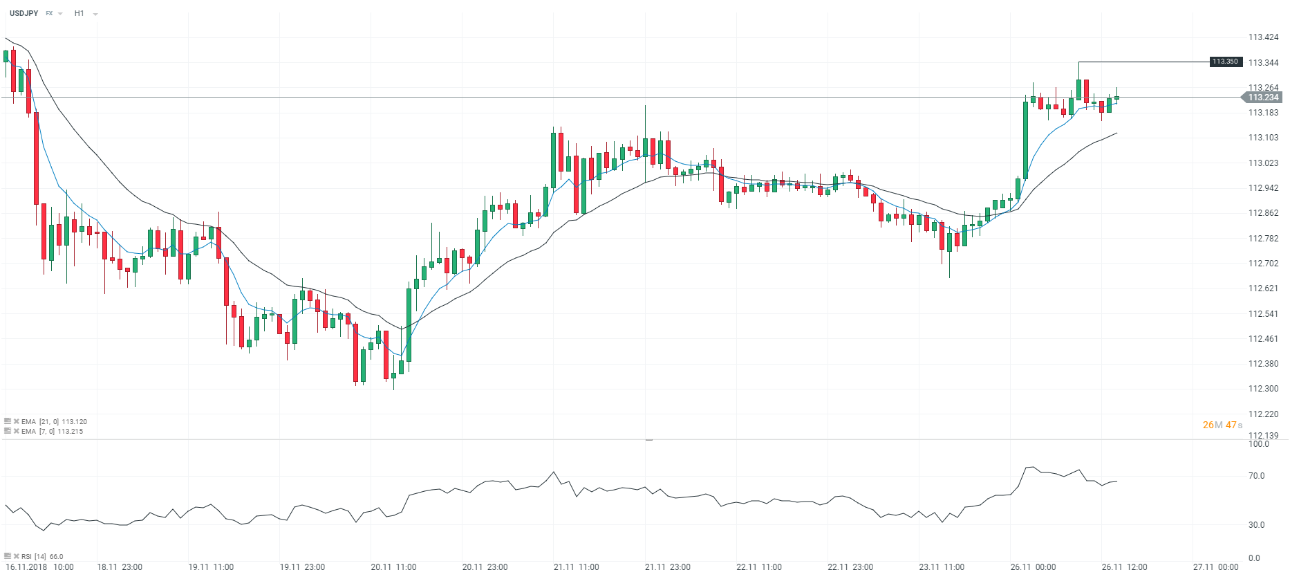 Au Japon, l’indice PMI manufacturier est ressorti inférieur aux attentes du consensus à 51,8, en donnée préliminaire au mois de novembre. En effet, le consensus anticipait une valeur autour de 53. Sur le volet des changes, la paire USDJPY est portée par la performance de l’indice NIKKEI 225. Ce dernier a terminé la séance en hausse de 0,76 % à 21 812 points grâce au rebond de la demande intérieure et à l’attribution à Osaka de l’Exposition universelle 2025. D’un point de vue technique, la paire USDJPY évolue en tendance haussière en unité de temps horaire (H1). En effet, nous observons sur le graphique ci-dessus que les prix sont portés par les moyennes mobiles à 7 et 21 périodes à court terme. En outre, le RSI est orienté à la hausse et progresse en direction de sa zone de surachat. Pour conclure, nous avons un biais positif sur la paire et pensons qu’elle pourrait retrouver le niveau des 113,35 ¥ pour 1 $ à court terme.
