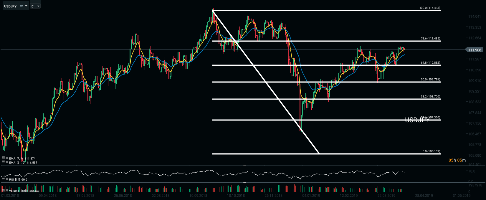 Représentation technique de la paire USDJPY, en D1