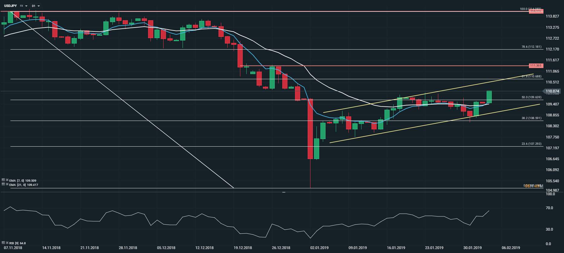 Cette jonction d’éléments s’illustre par l’évolution de la parité USD/JPY sur un canal haussier. En effet, celle-ci est soutenue par les moyennes mobiles à 7 et 21 périodes en unité de temps journalière (D1). A court terme, nous avons un biais positif sur la paire.