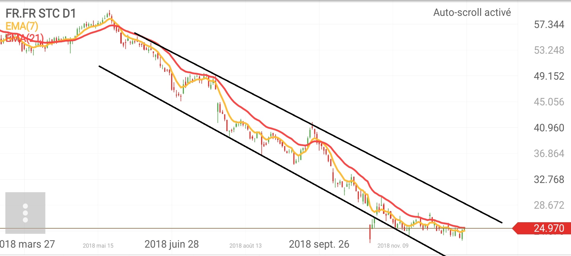 Sur le plan technique, le titre VALEO évolue en tendance baissière en unité de temps journalière (D1). En effet, nous observons sur le graphique ci-dessus que les prix fluctuent à l’intérieur d’un canal descendant, et ce, depuis plusieurs mois. En outre, nous notons que les cours sont capés par les moyennes mobiles à 7 et 21 périodes. Toutefois, dans la mesure où les canaux baissiers sont souvent cassés par le haut, nous avons un biais haussier sur le titre et pensons qu’il pourrait rallier le niveau des 30 € à moyen/long terme.