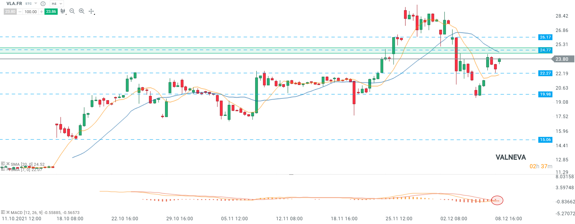 Les cours de Valneva (VLA.FR) ont ouvert avec léger gap haussier, se dirigeant vers la résistance à 24,77 au moment de la rédaction de ces lignes. On remarque d’un point de vue technique que les courbes MACD et Signal s’apprêtent à se croiser. Le sens du croisement nous donnera soit un signal d’achat ou un signal de vente. Si un mouvement baissier venait à apparaître, la zone de support de 22,27 serait à envisager. Source : xStation5