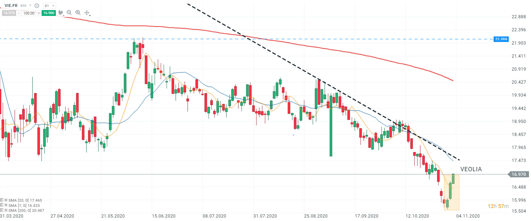 Le titre VEOLIA (VIE.FR) a débuté la session d’aujourd’hui à la hausse. Les cours se sont affranchi de la SMA7(ligne orange). Si le mouvement haussier se poursuit, les cours pourraient aller tester la zone des 17,473 euros (SMA20, ligne bleue). Un franchissement de l’oblique baissière serait un signal et permettrait de rallier le sommet de juin à 22,066 euros .Le mouvement à la hausse semble se confirmer par la présence des 3 soldats blancs (rectangle orange).