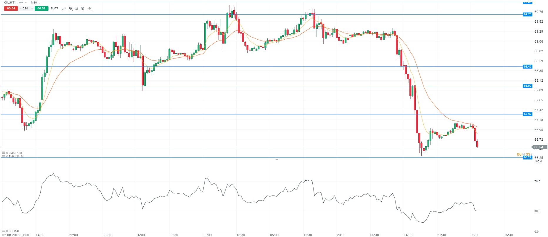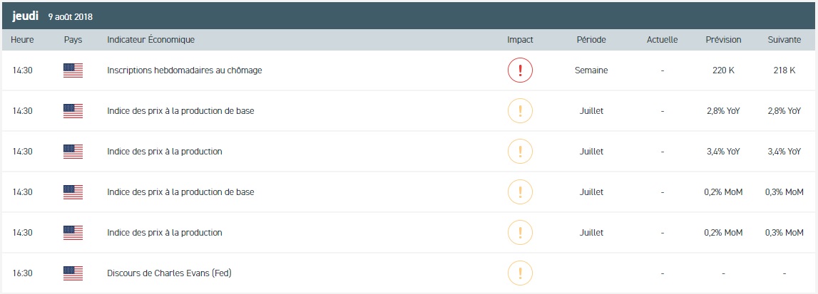 Sur le plan des matières premières, le contrat WTI a terminé mercredi en forte baisse de 3,41% au niveau des 66,81 dollars le baril. Le retour des inquiétudes liées au conflit commercial entre la Chine et les Etats-Unis a pénalisé les cours. De plus, on note une contraction de la demande des petites raffineries indépendantes en Chine malgré la reprise des importations de brut en juillet. Enfin, le département américain de l’Energie a fait état d’une contraction des stocks de brut de 1,3 millions de barils pour la semaine terminée au 3 août. Dans le même temps, les stocks d’essence et de produits distillés ont augmenté de respectivement 2,9 millions de barils et 1,2 million de barils. D’un point de vue technique, les prix évoluent sous les moyennes mobiles (à 7 et 21 périodes) en unité de temps M30. Le RSI est orienté à la baisse vers sa zone de survente. En conclusion, nous avons un biais vendeur avec comme objectif le niveau des 66,29 dollars le baril.