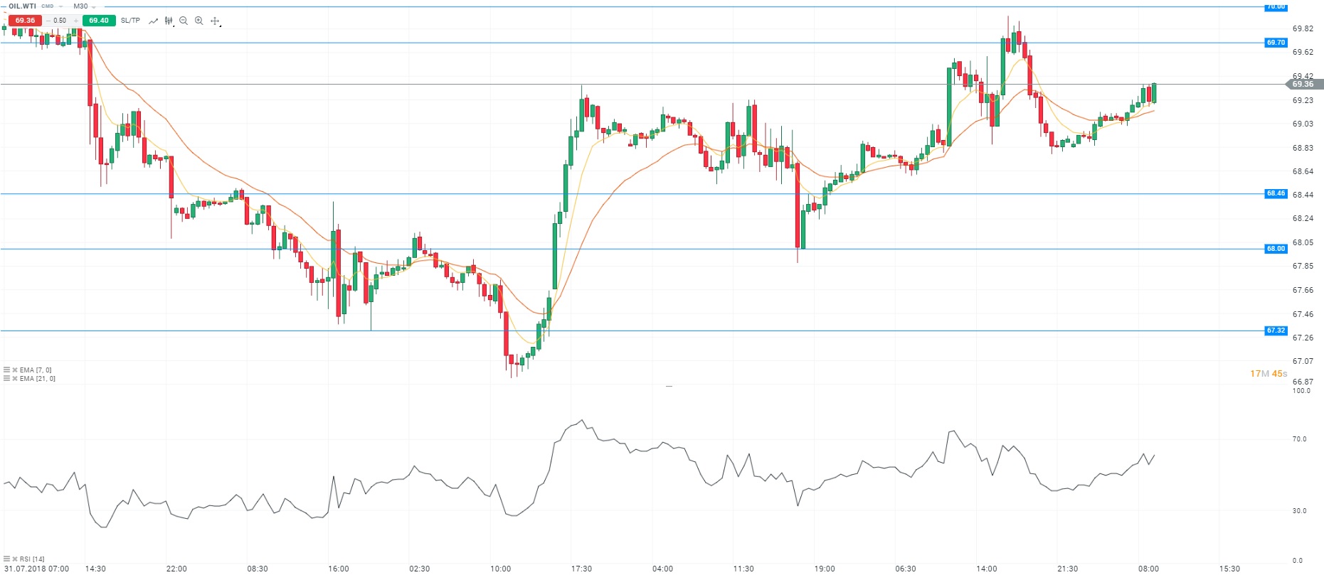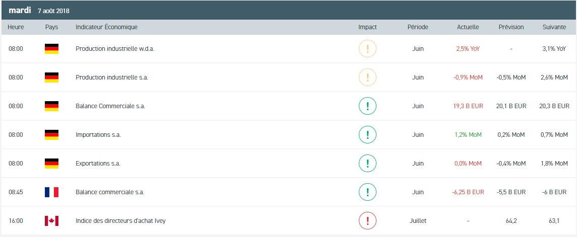 Sur le plan des matières premières, le contrat WTI a terminé lundi en hausse de 0,72% au niveau des 73,74 dollars le baril. Les prix sont soutenus par des informations en provenance de l’OPEP selon lesquelles l’Arabie Saoudite aurait extrait 10,29 millions de barils par jour au mois de juillet, contre 10,49 millions en juin. Cette réduction de l’activité intervient malgré l’engagement de la Russie et de l’Arabie Saoudite à augmenter leur production à partir du mois de juillet. Ces informations inquiètent les investisseurs sur le niveau de l’offre sur fond d’un retour des sanctions américaines contre l’Iran. D’un point de vue technique, les prix évoluent autour de la moyenne mobile courte (à 7 périodes) en unité de temps M30. Le RSI est orienté à la hausse autour de sa zone de neutralité. En conclusion, nous avons un biais acheteur avec comme objectif le niveau des 69,70 dollars le baril.