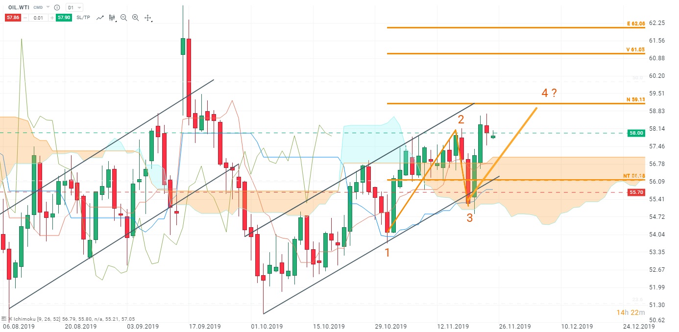 Le pétrole devrait également profiter de l’optimisme ambiant sur les marchés, lui permettant ainsi de poursuivre la construction de la seconde jambe impulsive de la structure en « N », avec pour objectif les 59$. Pour l’heure le WTI est sous une résistance majeure à 58$. Un franchissement de ce niveau permettrait au pétrole WTI de rallier les 59$ sur le corut terme, en revanche, toute cassure de la SSB à 57,10$ invaliderait e scénario et reverrait le WTI vers le bas de son canal haussier aux alentours des 56,15$.