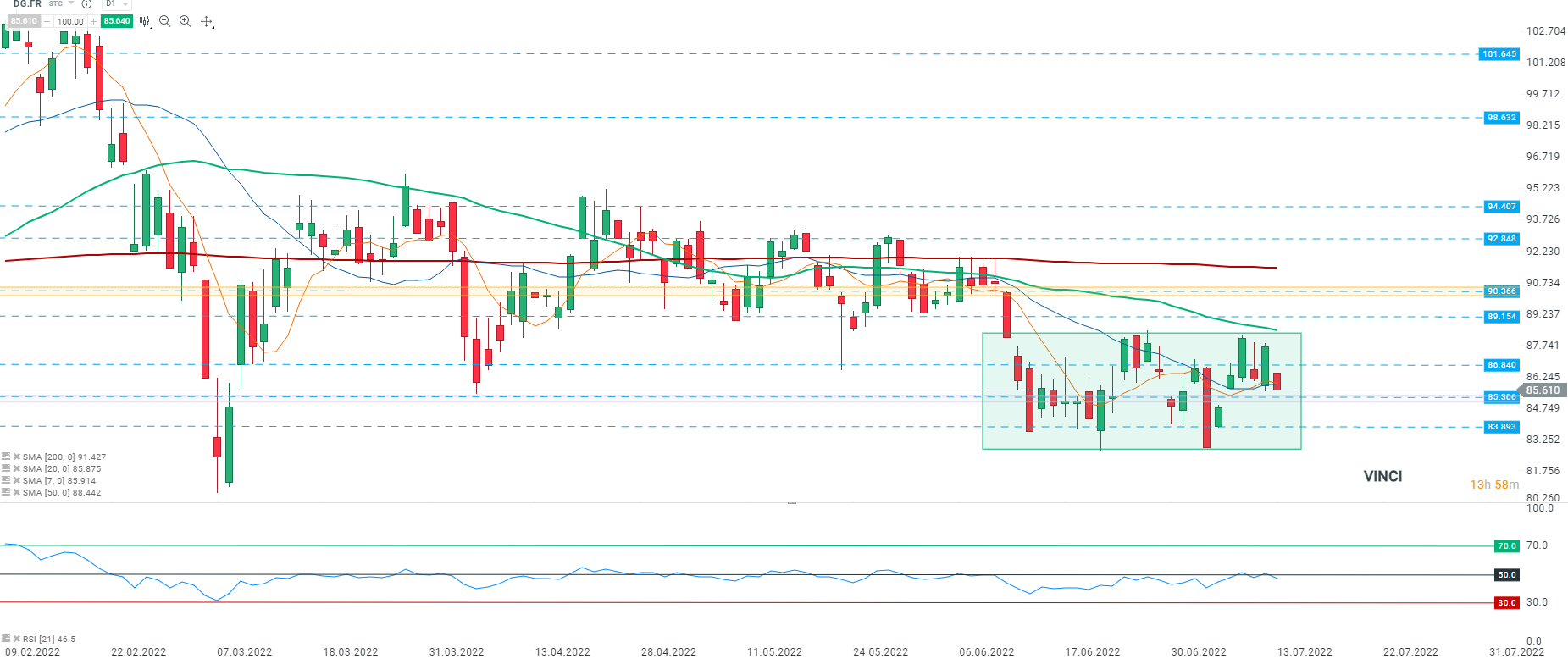 Les cours de Vinci (DG.FR) continuent d’évoluer de manière latérale et ont entamé la séance d’aujourd’hui à la baisse, se dirigeant vers le support à 85,306 au moment de la rédaction de ces lignes. Si le sentiment actuel prévaut, le support à 83,893 constitue la prochaine cible pour les vendeurs, dernier rempart avant la borne inférieure du range à 82,843. De plus, le RSI évolue en dessous de la zone de neutralité de 50, signifiant que les vendeurs ont toujours l’avantage. Source : xStation5