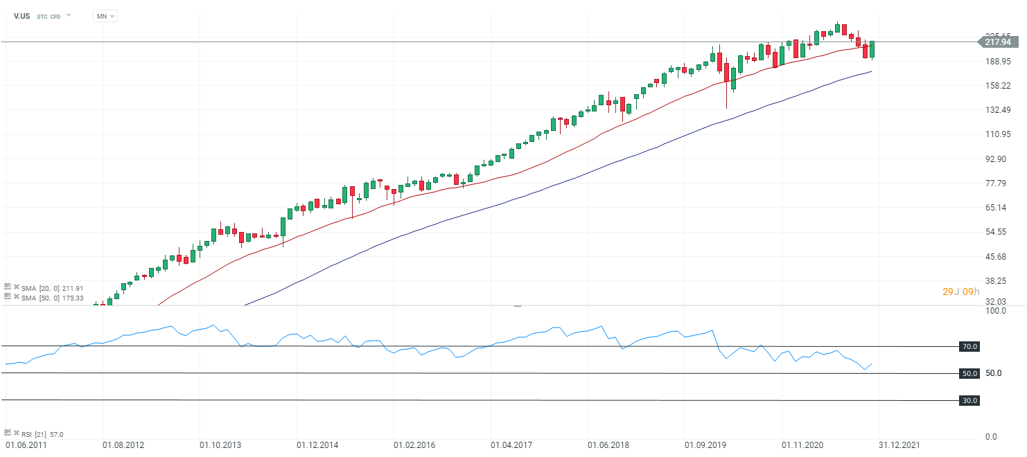 D’un point de vue fondamental, il faut rester à l’affût quant à l’action Visa. Nous sommes dans un contexte où les investisseurs n’ont pas d’autres alternatives que d’investir sur des actifs risqués, mais cela pourrait changer en 2022 avec le resserrement des politiques américaines et européennes. Cela pourrait engendrer des fluctuations négatives sur la globalité des marchés US, mais nous n’y sommes pas encore.
