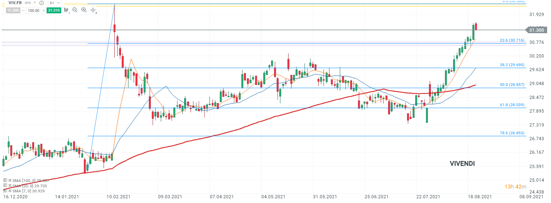 Après 8 séances consécutives de hausse, le titre Vivendi (VIV.FR) entame la première séance de la semaine en territoire négatif. Au moment de la rédaction de ces lignes, les cours se replient en direction du retracement de Fibonacci à 23,6% de la hausse entamée le 01/02. Toutefois, si les acheteurs reprennent le contrôle, le record historique à 32,382 constitue la prochaine cible. Source : xStation5