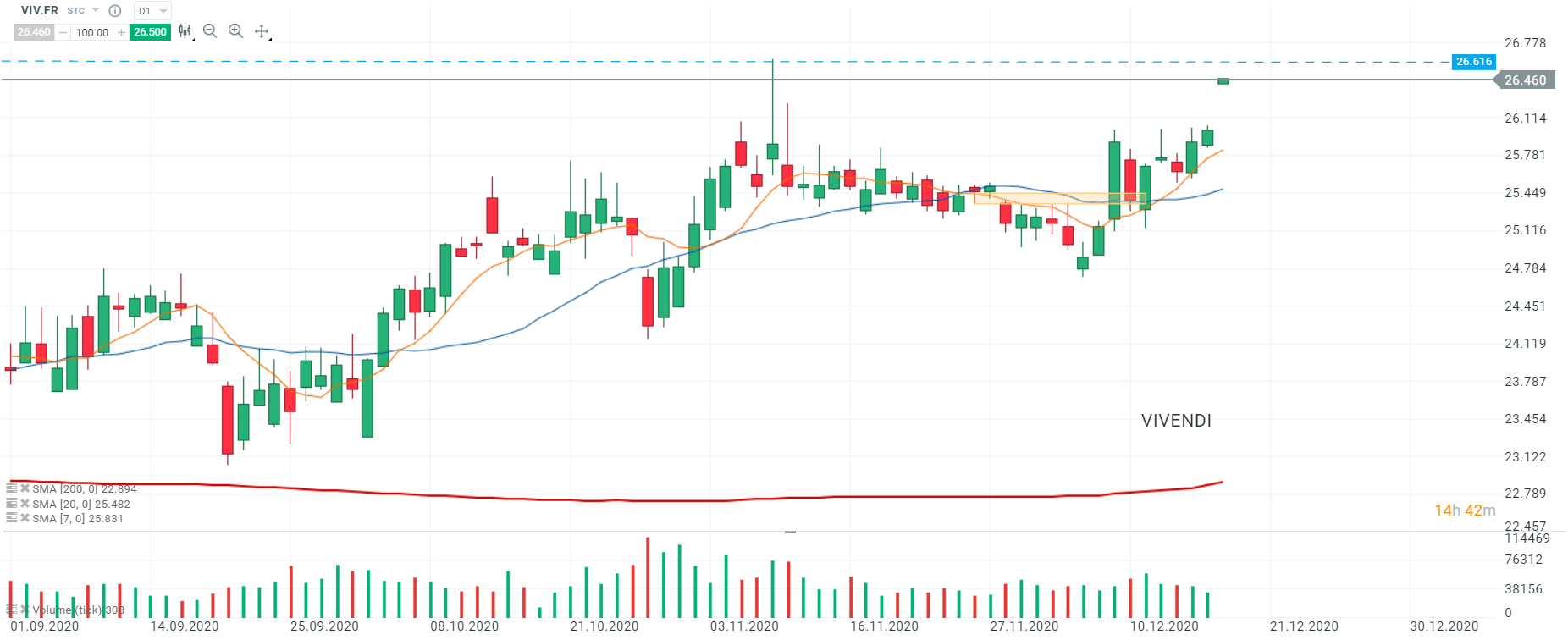 Les cours de Vivendi (VIV.FR) ont ouvert avec un important gap haussier et ont réussi à s’éloigner de la zone de support clé (rectangle orange) en prenant appui sur la SMA 7 et se dirigent vers le sommet du 09/11 à 26,616. Source : xStation5