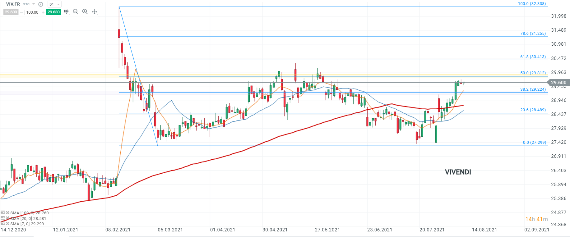 Les cours de Vivendi (VIV.FR) ont progressé de plus de 12% depuis le début d’année. Aujourd’hui, les cours entament la séance à la hausse se dirigeant vers le retracement de Fibonacci à 50% de la baisse amorcée le 15/02. En cas de franchissement de ce niveau, le mouvement haussier pourrait s’étendre en direction du prochain niveau de retracement à 61,8% (30,41). Toutefois, si les vendeurs prennent le contrôle, la zone coïncidant avec la SMA 7 (ligne orange) et le niveau de retracement à 38,2% à 29,22 constitue la prochaine cible.Source : xStation5