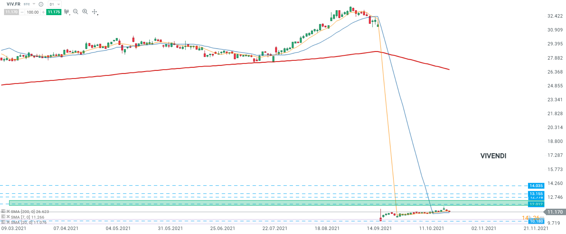 Les cours de Vivendi (VIV.FR) évoluent de manière latérale depuis le gap du 21/09 après la séparation avec Universal Music. Malgré la nouvelle positive de la demande de prise de participation, les cours de Vivendi évoluent à la baisse, se dirigeant vers le support à 10,180. Toutefois, si les acheteurs prennent le contrôle, la résistance à 12,012 serait à envisager. Source : xStation5