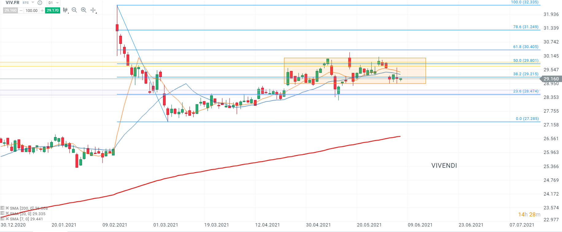 Les cours de Vivendi (VIV.FR) évoluent depuis fin avril dans un range avec pour borne inférieure 28,962 et pour borne supérieure 30,054. Au moment de la rédaction de ces lignes, les cours tentent de se hisser au-dessus du retracement de Fibonacci à 38,2% de la baisse amorcée le 16/02. En cas de franchissement de ce niveau, le mouvement haussier pourrait s’étendre en direction du retracement à 50% à 29,801. Toutefois, si les vendeurs prennent le contrôle, la borne inférieure du range constitue la prochaine cible. Source : xStation5