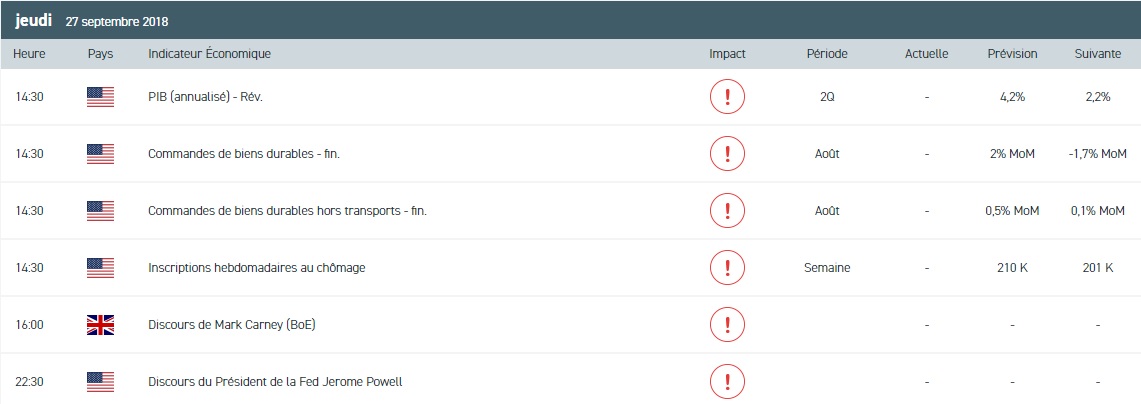 Comme prévu, la Réserve fédérale (Fed) a relevé ses taux directeurs. Néanmoins, les indices ont ouvert en baisse après les rumeurs de report des discussions sur le budget italien. L’euro accuse un repli significatif face au dollar US. L’actif fluctue autour de 1,17 $ pour 1 €. Pour aujourd’hui, on s’intéressera à l’indice des prix à la consommation du mois de septembre en Allemagne. Du côté des Etats-Unis, nous assisterons à la publication des commandes de biens durables au titre du mois d’août, à la croissance du produit intérieur brut du deuxième trimestre et aux promesses de ventes de logements du mois d’août. Par ailleurs, la session boursière sera dominée par les discours des grands argentiers de la planète (Mario Draghi – BCE, Mark Carney – BoE, Jerome Powell – Fed et Stephen Polow – BoC).