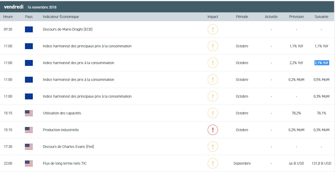 Aux Etats-Unis, les ventes au détail ont progressé de 0,8 % au mois d’octobre. Evidemment, il s’agit d’une valeur nettement supérieure aux attentes du consensus qui tablait sur une hausse de 0,6 % au titre du mois dernier. Par ailleurs, les inscriptions hebdomadaires au chômage ont augmenté de 2 000 à 216 000 inscriptions pour la semaine terminée au 10 novembre. Toujours sur le front de la macroéconomie, l’indice d’activité manufacturière Empire State de la région de New York est ressorti supérieur aux prévisions des économistes à 23,3, contre des attentes autour de 19,3. En revanche, le même indice pour la région de Philadelphie s’est contracté de 9,3 points à 12,9 au titre du mois de novembre. Dans ce contexte, les indices américains ont terminé en hausse jeudi. La toile de fond haussière devrait se poursuivre ce vendredi.