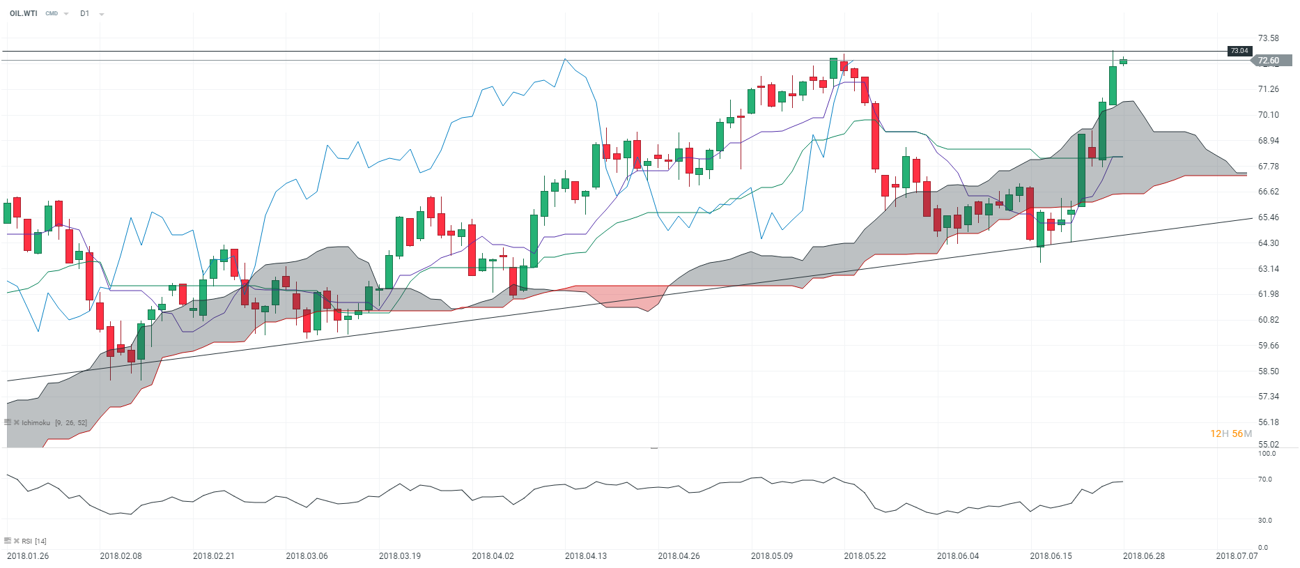 D’un point de vue technique, l’actif évolue en tendance haussière en unité de temps journalière (D1). En effet, nous observons sur le graphique ci-dessus que les prix sont portés par le nuage Kumo, la Tenkan (courbe mauve) et la Kijun (courbe verte). En outre, nous notons que la Lagging-Span (courbe bleue) est orientée à la hausse et qu’elle fluctue désormais au-dessus des prix. En somme, la toile de fond technique est très positive. Bien que nous anticipions de prises des bénéfices à court terme, nous pensons que les prix pourraient s’affranchir de la résistance fixée à 73,04 $ à moyen terme.