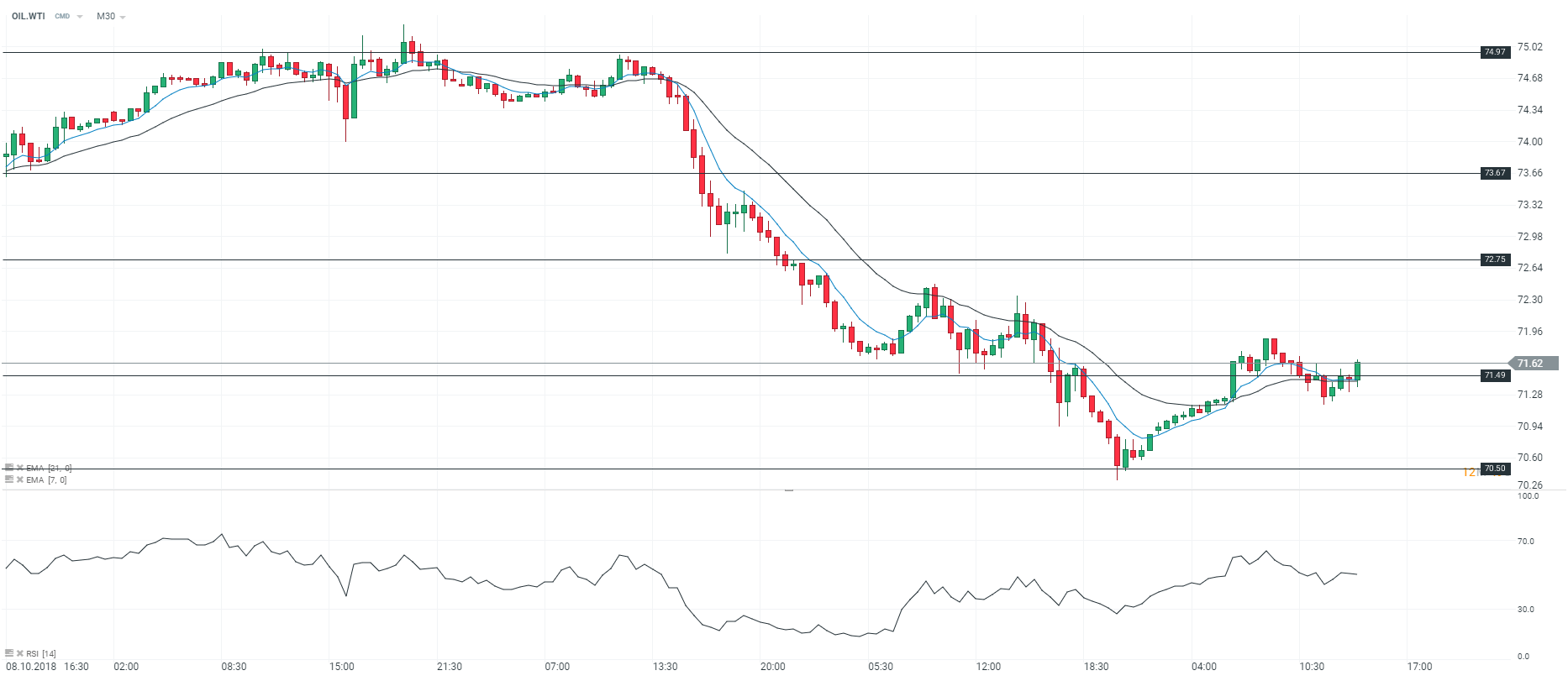 D’un point de vue technique, le contrat WTI évolue en tendance baissière en unité de temps 30 minutes (M30). Toutefois, nous notons la présence de fortes intentions acheteuses sur l’actif. En effet, nous remarquons que les cours sont soutenus par les moyennes mobiles à 7 et 21 périodes. De plus, le RSI est stable et fluctue au-dessus de sa zone de neutralité. Pour conclure, nous avons un biais positif sur le contrat WTI et estimons que l’actif devrait rallier le niveau des 72 $ le baril.