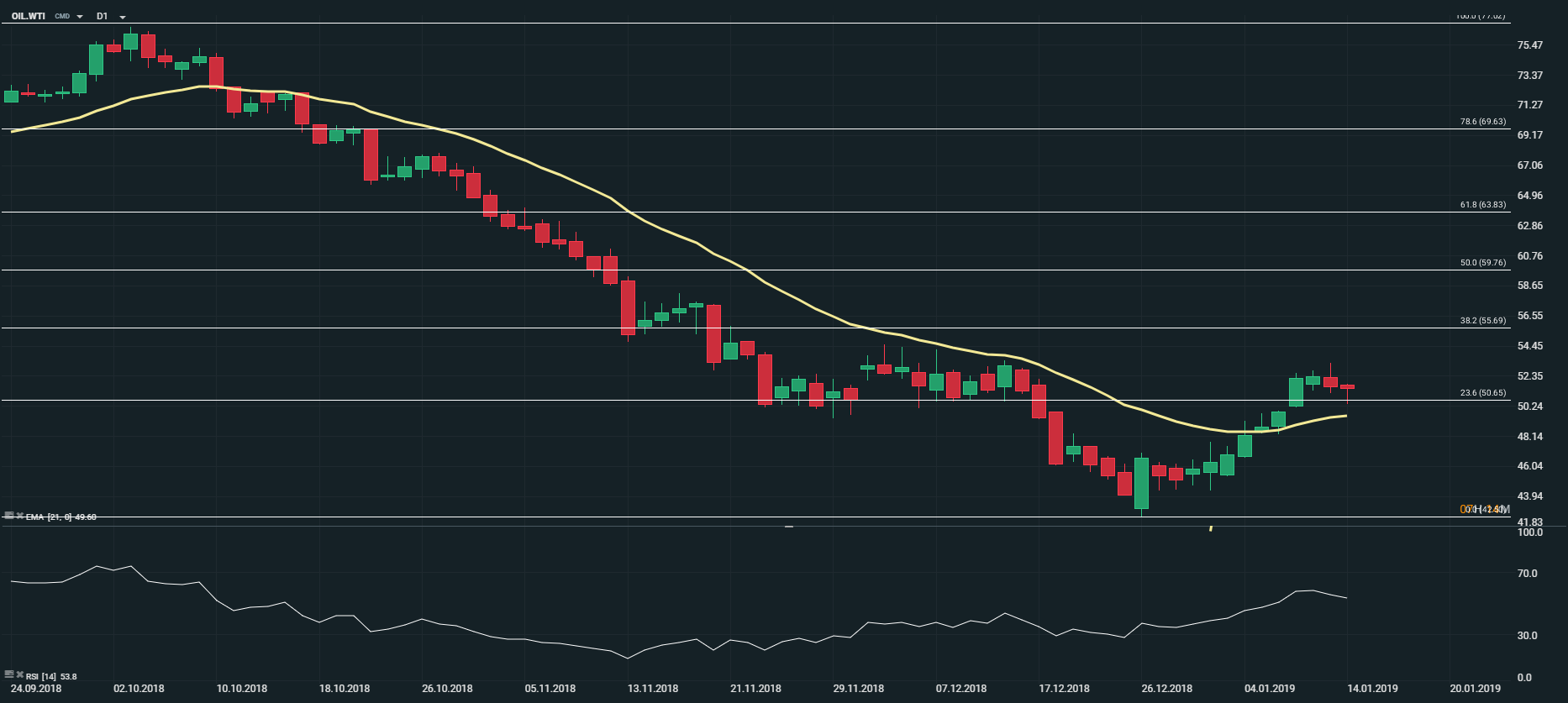 Après une hausse de 7,6 % la semaine dernière, le WTI évolue désormais autour des 51,72 $ le baril, au moment où nous écrivons ces lignes. Bien sûr, le sentiment général de pessimisme à l’égard de la saison des résultats et les tensions commerciales sino-américaines pénalisent la tendance. Sur le plan technique, la toile de fond est positive à court terme, et ce, malgré le repli du jour. Les prix sont toujours soutenus par le support des 23,6 % des retracements de Fibonacci et la moyenne mobile à 21 périodes. En dépit de la contraction du jour, nous conservons un biais positif sur le WTI et pensons qu’il pourrait renouer avec le seuil des 55,69 $ à court/moyen terme, soit le niveau des 38,2 % des retracements de Fibonacci.