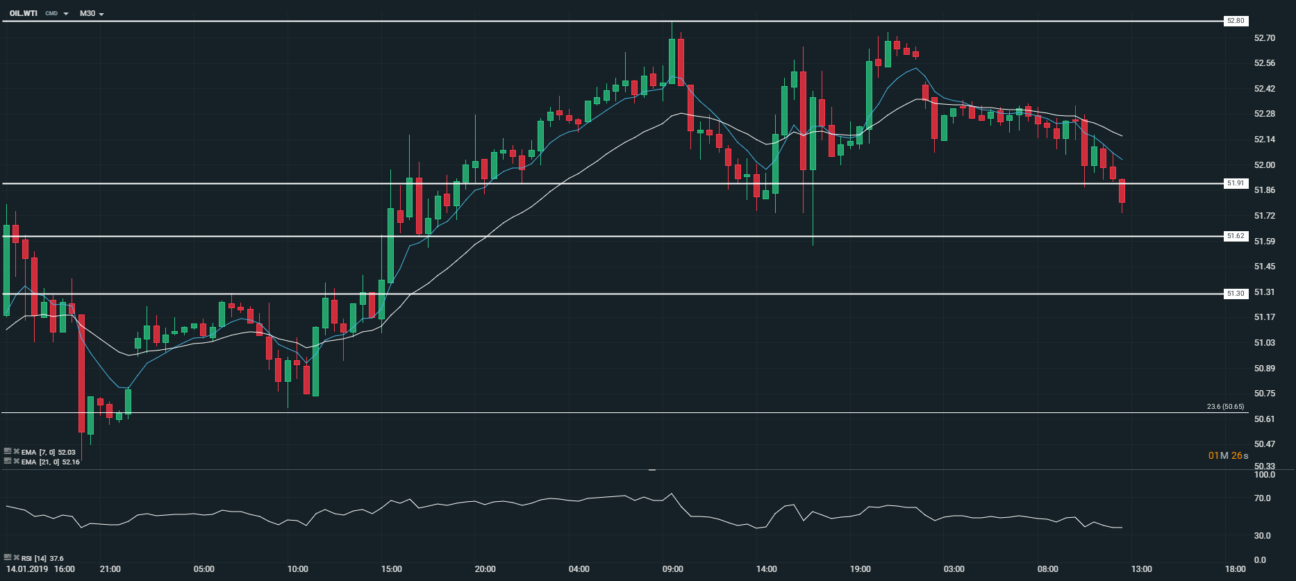 D’après le dernier rapport de L’OPEP, la demande mondiale journalière devrait fluctuer autour de 1,29 million de bpj en 2019. Sur le plan technique, la toile de fond est baissière en unité de temps 30 minutes (M30). En effet, nous observons sur le graphique ci-dessus que les prix sont capés par les moyennes mobiles à 7 et 21 périodes. De plus, le RSI est orienté à la baisse et oscille sous sa zone de neutralité autour de 39,5. Dans la mesure où le support des 51,91 $ n’est plus d’actualité, nous avons un biais baissier à court terme. En revanche, nous maintenons notre avis positif à moyen terme et estimons qu’il devrait renouer avec le niveau des 55,69 $.