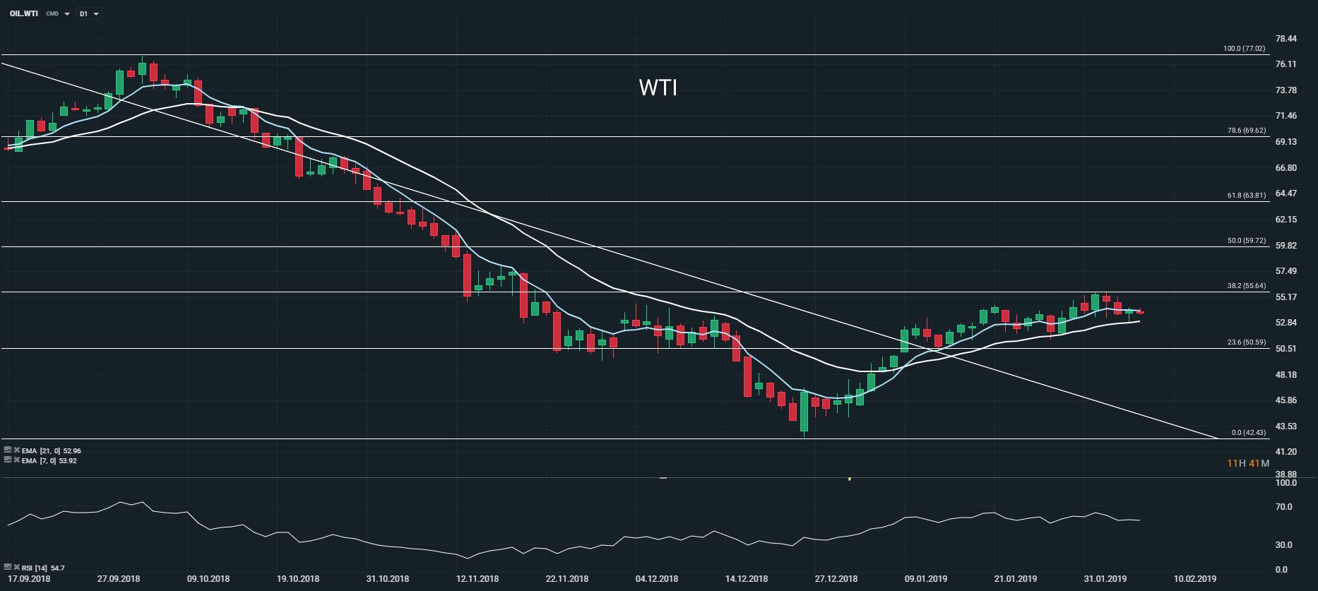 Sur le plan technique, le WTI évolue en tendance haussière en unité de temps journalière (D1). En effet, nous observons sur le graphique ci-dessus que les prix sont soutenus par la moyenne mobile à 21 périodes. En outre, le RSI est stable et fluctue au-dessus de sa zone de neutralité, autour des 54,1. Néanmoins, nous remarquons que le WTI fait l’objet d’une pression baissière à court terme car les prix sont retenus par la moyenne mobile à 7 périodes. Enfin, malgré les quelques vecteurs baissiers, nous avons un biais très positif sur le contrat WTI et anticipons une poursuite de la progression des cours du pétrole à court/moyen terme.