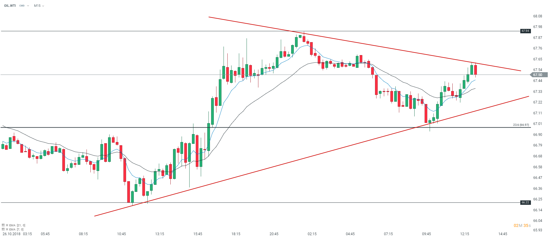 Sur le plan technique, le WTI évolue en tendance haussière en unité de temps 15 minutes (M15). En effet, nous observons sur le graphique ci-dessus que les prix sont portés par les moyennes mobiles à 7 et 21 périodes. De plus, les cotations fluctuent à l’intérieur d’un triangle symétrique depuis plusieurs heures. Pour conclure, nous avons un biais acheteur sur le WTI et anticipons un retour des prix sur le niveau des 68 $ le baril à court terme.