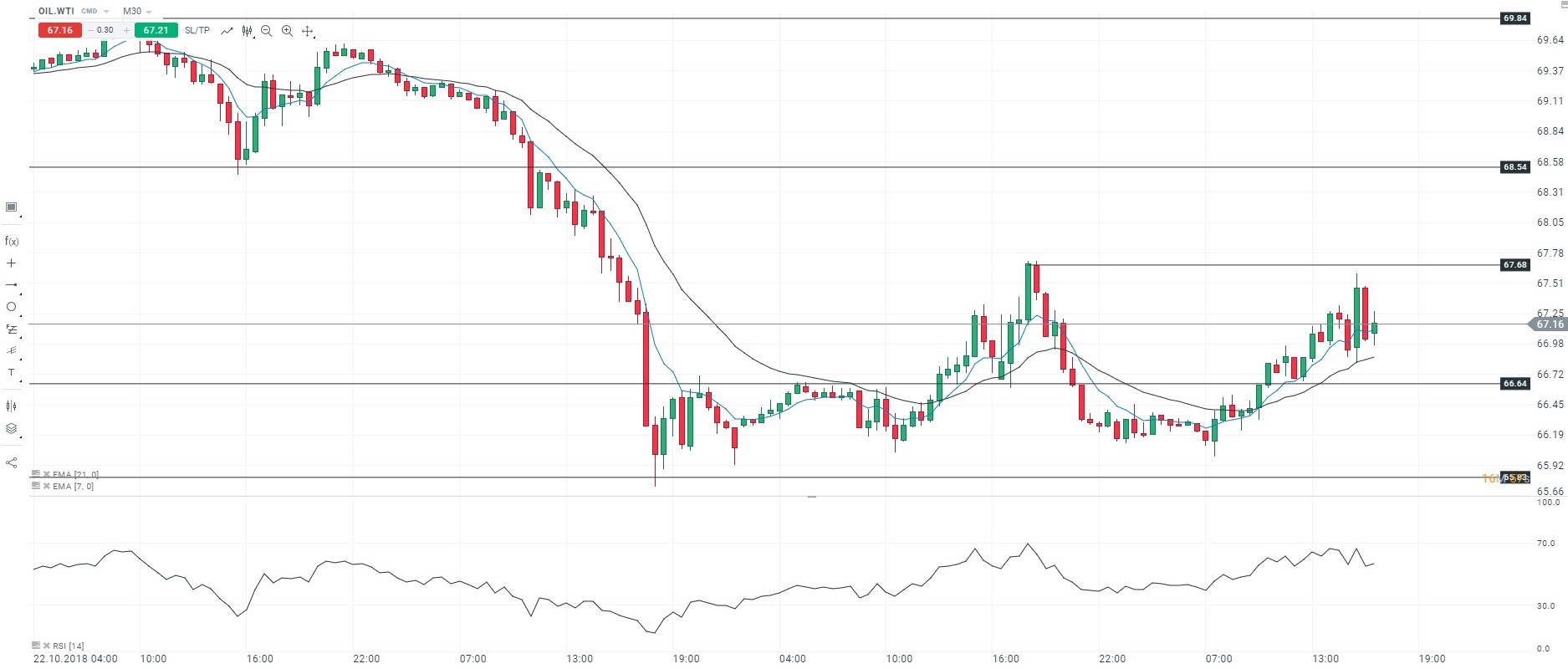 Au moment où nous écrivons ces lignes, le WTI progresse de 0,45 % à 67,16 $ le baril. Sur le plan technique, le WTI évolue en tendance haussière en unité de temps 30 minutes (M30). En effet, nous observons sur le graphique ci-dessus que les prix sont soutenus par les moyennes mobiles à 7 et 21 périodes. De plus, le RSI est stable et fluctue au-dessus de sa zone de neutralité. Pour conclure, nous avons un biais haussier sur le WTI et pensons qu’il devrait retrouver le niveau des 68,54 $ le baril à court terme.