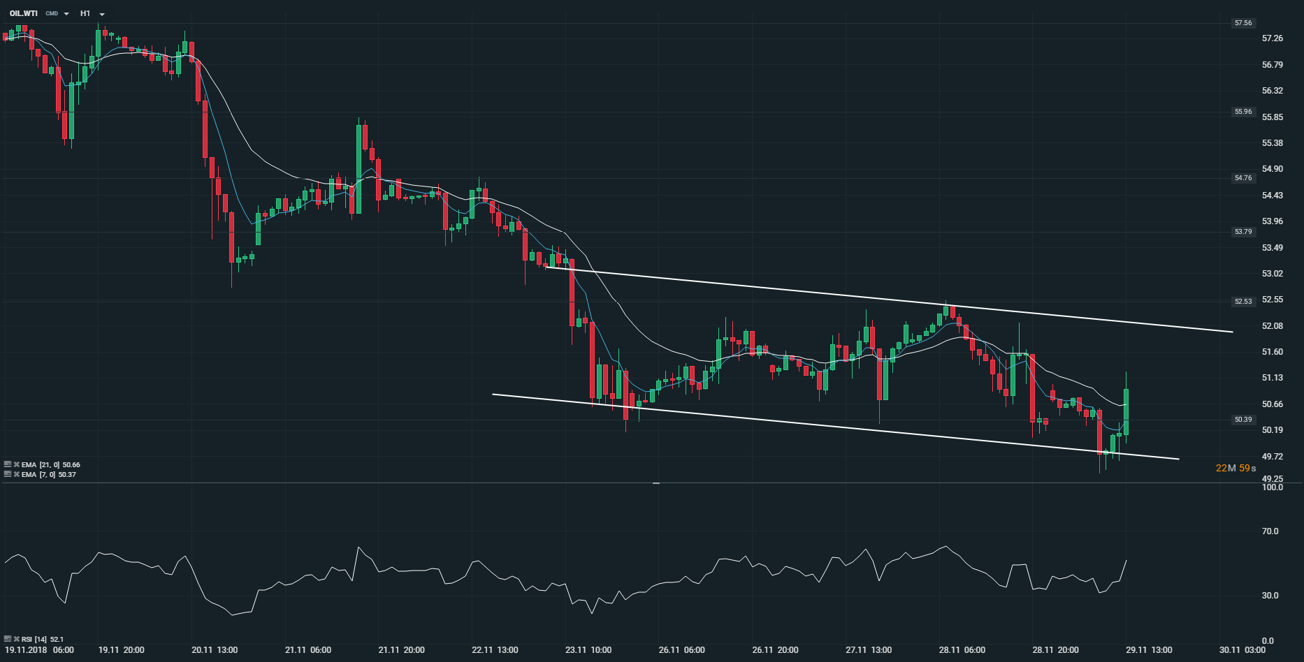 Après avoir cassé le support psychologique des 50 $ le baril ce matin, le WTI retrouve des couleurs de manière spectaculaire. En effet, au moment où nous écrivons ces lignes, la référence américaine évolue autour des 51 $ le baril. Sur le plan technique, la toile de fond est baissière en unité de temps horaire (H1). En effet, nous observons sur le graphique ci-dessus que les prix fluctuent à l’intérieur d’un canal baissier à court terme. Toutefois, nous remarquons que les prix sont soutenus par les moyennes mobiles à 7 et 21 périodes depuis moins d’une heure et que le RSI progresse au-dessus de sa zone de neutralité. Dans un tel contexte, nous avons un biais acheteur sur le WTI et pensons que la toile de fond va se poursuivre en direction des 52 $.