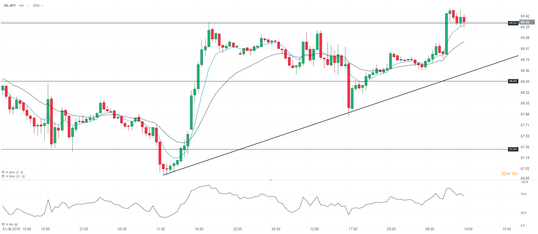 D’un point de vue technique, l’indice évolue en tendance haussière en M30. En effet, nous observons sur le graphique ci-dessus que les prix sont soutenus par les moyennes mobiles à 7 et 21 périodes. Dans le même temps, le RSI est orienté à la hausse et fluctue à l’intérieur de sa zone de surachat. Pour conclure, nous conservons un avis acheteur sur le WTI et estimons qu’il pourrait retrouver le niveau de 70,5 $ le baril à court terme.
