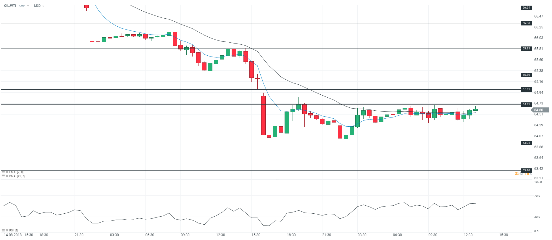 Au moment où nous écrivons ces lignes, le contrat WTI gagne 0,2 % à 64,6 $ le baril. Sur le plan technique, la toile de fond est baissière en unité de temps 30 minutes (M30). Le marché est sous pression en raison du retour de la Lybie sur le marché et de l’augmentation des stocks aux Etats-Unis. D’après le département de l’Energie américain (DoE), les stocks de brut ont encore augmenté de 6,8 millions de barils la semaine dernière. Enfin, les stocks de produits distillés (fioul domestique) ont progressé de 3,56 millions de barils. En revanche, les stocks d’essence se sont repliés de 740 000 barils. Toutefois, nous faisons état de velléités haussières à court terme car les prix sont soutenus par les moyennes mobiles à 7 et 21 périodes. Dans ce contexte, nous avons un biais acheteur sur l'actif et pensons qu'il devrait rallier le niveau de 65,3 $ à court terme.