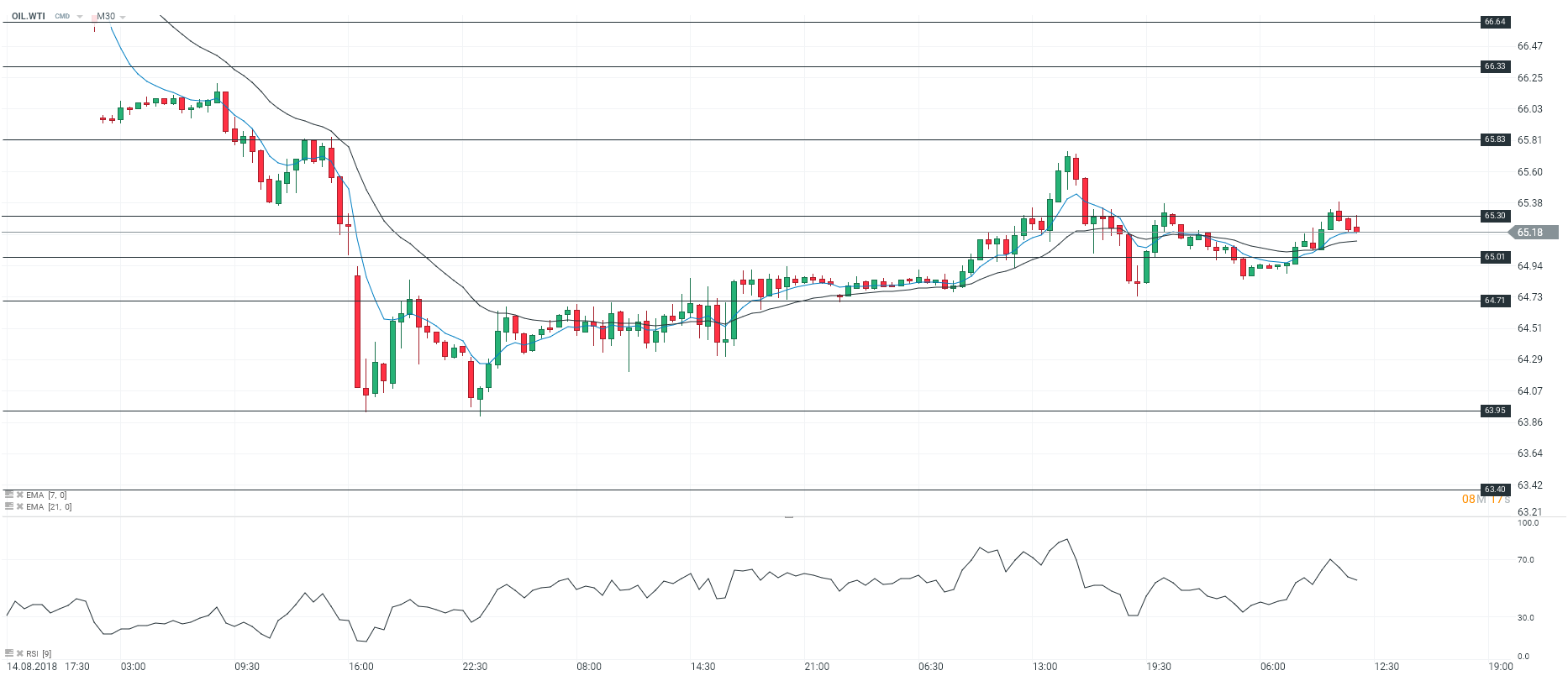Au moment où nous où nous écrivons ces lignes, le WTI est stable et fluctue autour de 65,2 $ le baril. La prudence continue de dominer le marché car les investisseurs craignent un ralentissement de la croissance chinoise et par conséquent une baisse de la demande. Du côté de la production pétrolière américaine, le nombre de puits forés est resté stable la semaine dernière à 869, selon Baker Hughes. En outre, la production journalière oscille autour de 10,9 millions de barils. L’ensemble de ces données laisse penser que la correction pourrait se poursuivre cette semaine.