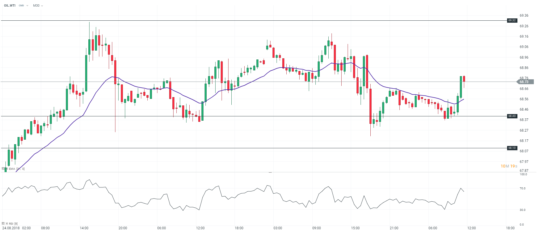 Au moment où nous écrivons ces lignes, le contrat WTI retrouve des couleurs et gagne 0,28 % à 68,72 $ le baril. Sur le plan technique, la toile de fond est positive car les prix fluctuent au-dessus de la moyenne mobile à 21 périodes en unite de temps 30 minutes (M30). Dans le même temps, le RSI est orienté à la hausse et se rapproche de sa zone de surachat. Du côté des fondamentaux, l’American Petroleum Institute (API) a fait état d’une légère augmentation des stocks de brut (+ 38 000 de barils) pour la semaine terminée au 24 août. Bien sûr, cette donnée devra être confirmée ce jour par le département de l’Energie américain (DoE). Au moment où nous écrivons ces lignes, le consensus anticipe une contraction des stocks de brut de 686 000 barils et une hausse des stocks d’essence de 370 000 barils sur la même période. Pour conclure, nous avons un biais acheteur sur le contrat WTI et estimons qu’il devrait retrouver le niveau de 69,32 $ le baril à court terme.