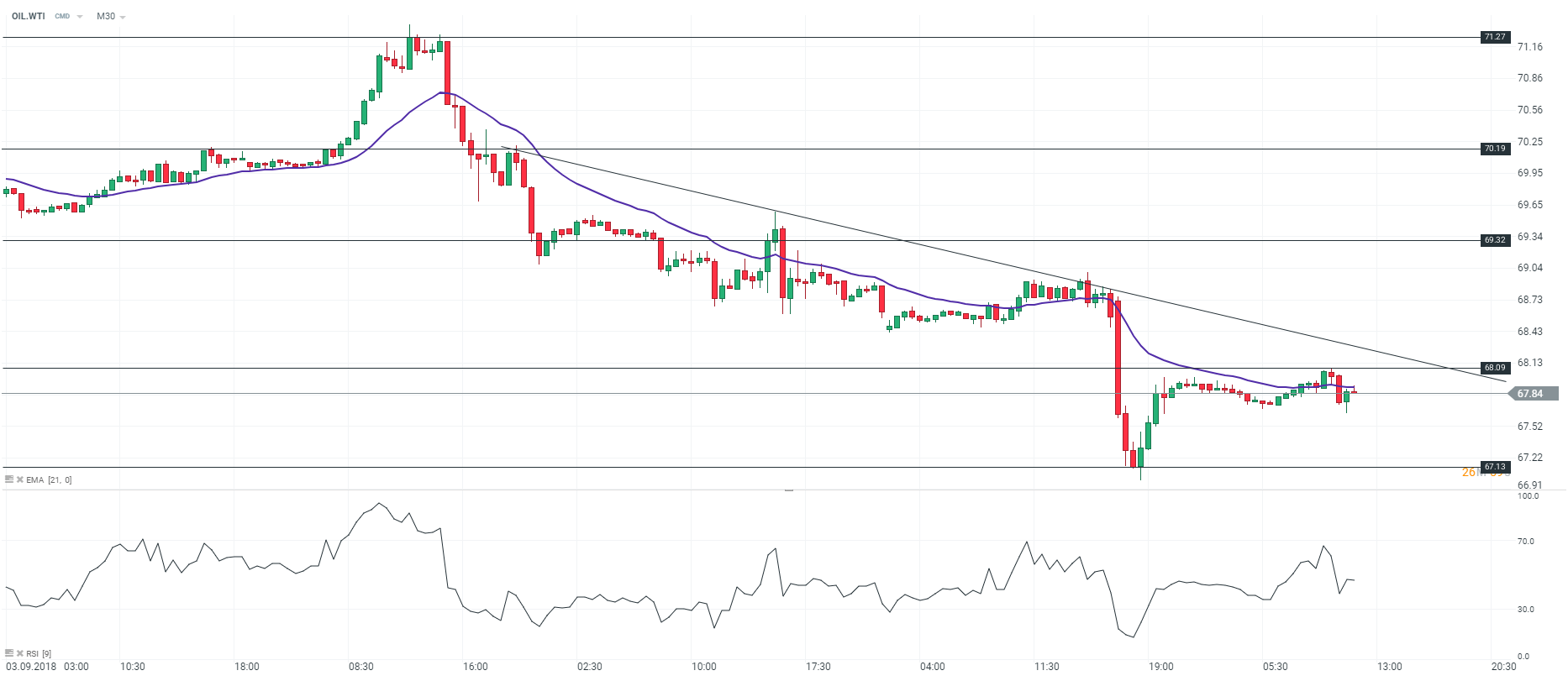 D’un point de vue technique, le contrat WTI évolue en tendance baissière en unité de temps 30 minutes (M30). En effet, nous observons sur le graphique ci-dessus que les prix sont capés par la moyenne mobile à 21 périodes. Outre ce point technique, nous remarquons la présence d’une oblique baissière et que l’orientation du RSI ne plaide pas en faveur des velléités acheteuses.