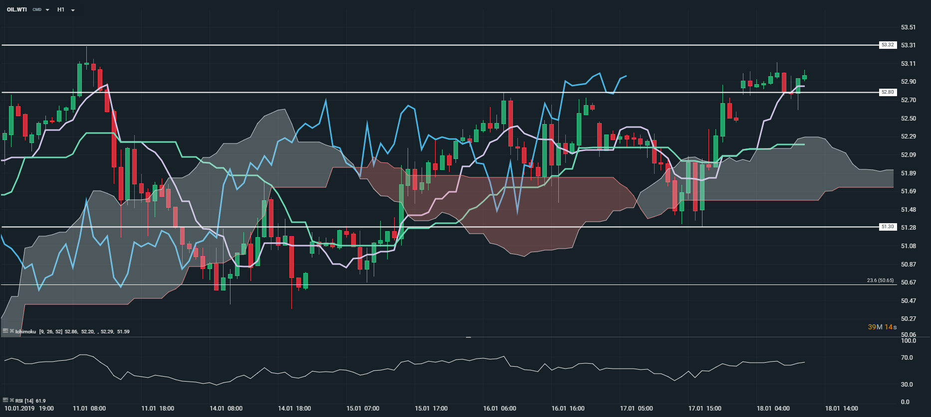 En unité de temps horaire (H1), le WTI donne des signaux très positifs. Malgré la volatilité de l’actif, nous notons que les prix se montrent résilients autour des 52 $. Au regard du critère Ichimoku, la toile de fond technique est haussière. Et pour cause, nous observons sur le graphique ci-dessus que les cours sont soutenus par le nuage Kumo, la Tenkan (courbe mauve) et la Kijun (courbe verte). De plus, la Lagging-Span (courbe bleue) est orientée à la hausse et oscille au-dessus des prix depuis quelques heures. Concernant le RSI, l’oscillateur est haussier et se rapproche de sa zone de surachat. En bref, nous avons un biais acheteur sur le WTI et estimons qu’il devrait rallier le niveau des 53,32 à court terme.