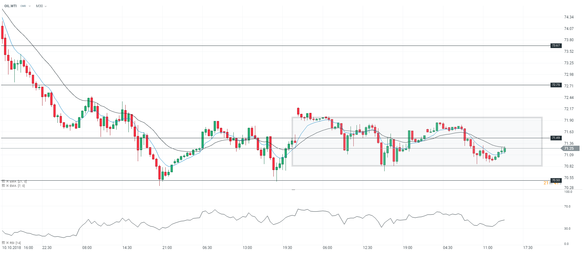 D’un point de vue technique, le WTI fluctue dans un « trading range » de 1,12 $ (71,98 – 70,86). Toutefois, nous faisons état d’intentions haussières sur l’actif à court terme car les prix sont soutenus par la moyenne mobile à 7 périodes. De plus, le RSI est orienté à la hausse et progresse au-dessus de sa zone de neutralité. Pour conclure, nous avons désormais un biais positif sur le contrat WTI et pensons qu’il pourrait retrouver le niveau des 71,95 $ à court terme.