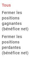 Dans le cas où vous avez plus d'une position ouverte, dans l'onglet « Positions ouvertes », vous pouvez cliquer sur le bouton « FERMER » et choisir de fermer : toutes les positions, seulement les positions rentables ou seulement les positions perdantes.