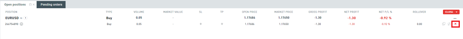 - Cliquez sur le bouton rouge "X" sur le côté droit de l'onglet « Positions ouvertes »