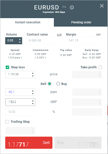 Le calculatrice intégré vous informera de la valeur nominale de la transaction, de la marge requise, de la valeur du spread, de la commission, de la valeur du pip et de la valeur quotidienne du swap. Si vous décidez de définir les niveaux Stop Loss ou Take Profit, le calculateur fournira également une estimation de la perte ou du profit au cas où l'un des ordres serait activé.