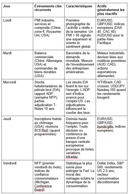 Les marchés fonctionnent selon un tempo quasi-rituel : à chaque jour ouvré correspondent des statistiques ou des annonces récurrentes qui orientent, parfois dès l’aurore, la psychologie des investisseurs. En prendre conscience, et programmer vos alertes dans le calendrier économique, revient à installer des balises afin de ne plus être surpris par une poussée de volatilité.