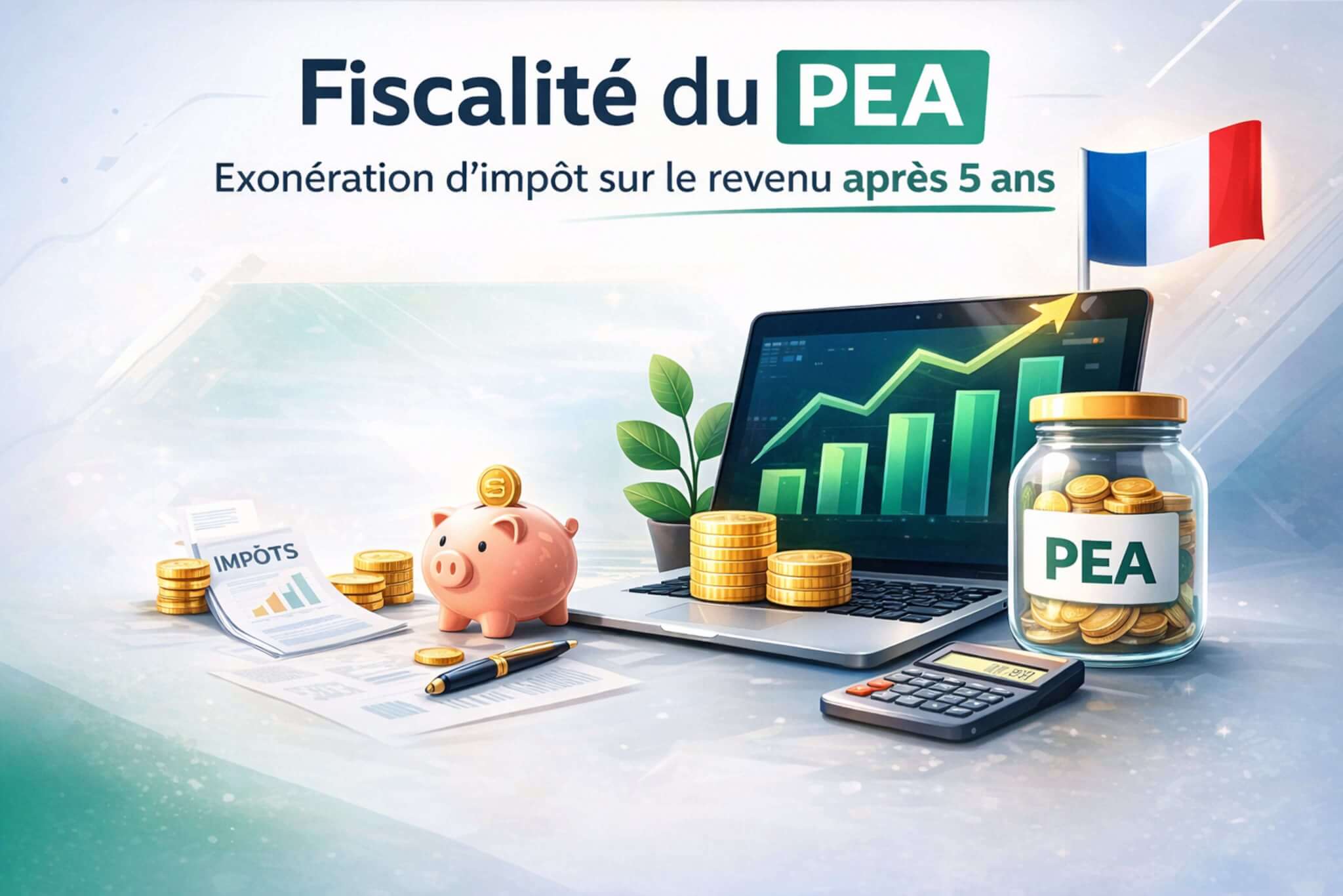 Le PEA fonctionne comme une enveloppe fiscale : tant qu’aucun retrait n’est effectué, les gains ne sont pas imposés. Après 5 ans, les gains retirés sont exonérés d’impôt sur le revenu et seuls les prélèvements sociaux restent dus.