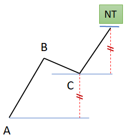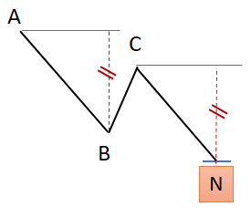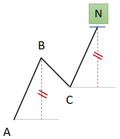 La théorie des vagues aura donc permis à Goichi Hosoda de dénombrer les différentes formations récurrentes sur les marchés. L’analyse poussée de ces formations lui a permis d’en tirer des projections de prix, plus communément appelées projections d’Hosoda, permettant de définir des objectifs de prix suite à la formation d’une vague, notamment à la formation du point C sur l’exemple des vagues en « N » décomposées en A, B, C et un objectif final N.