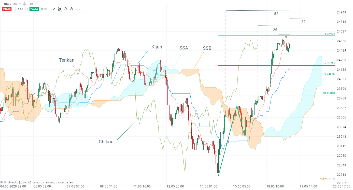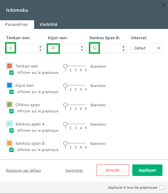 Les paramètres du système Ichimoku sont issus de la suite d’Hosoda. Ceux utilisés dans le calcul de la Tenkan et de la Kijun sont le premier et le dernier chiffre de base de la suite d’Hosoda (9, 17, 26)