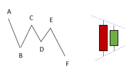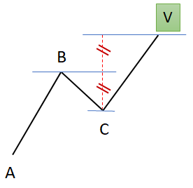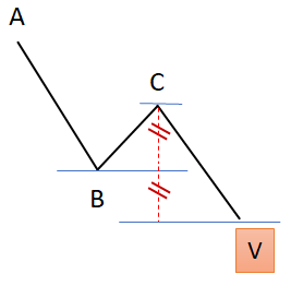 Vague en « V » : Une vague composée de deux vagues “I” successives, une forte impulsion haussière suivie d'une forte poussée baissière, ou une forte poussée baissière suivie d'une forte impulsion haussière.