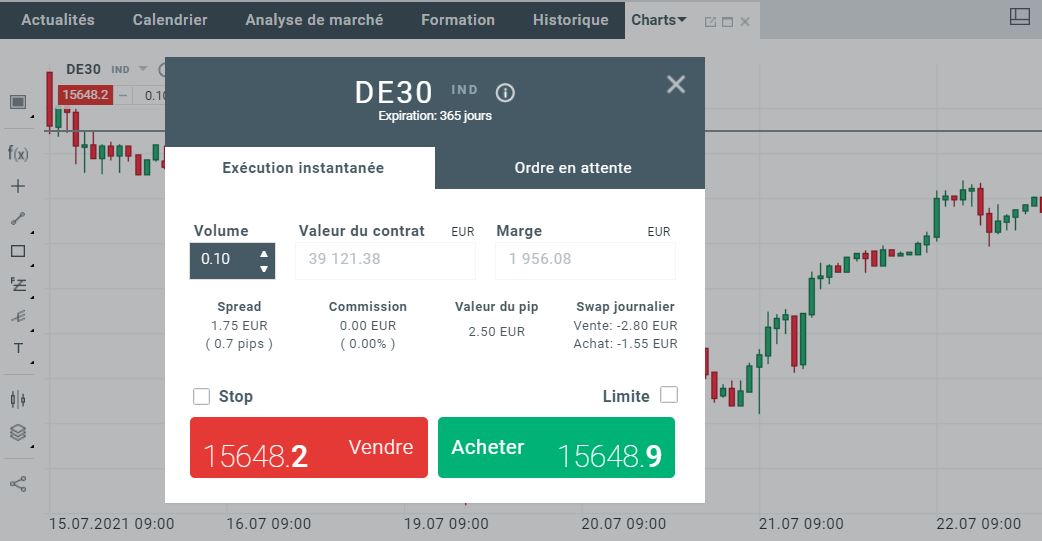 Les CFD sont des instruments à effet de levier, ce qui signifie que les investisseurs peuvent s'exposer au marché en ayant un dépôt relativement petit. En d'autres termes, les traders n'ont pas besoin de posséder de grosses sommes d'argent pour commencer à investir. Dans ce cas (DE30 sur le graphique ci-dessus) l'effet de levier est de 1:20, ce qui signifie que la marge requise s'élève à 5% de la valeur du contrat. Néanmoins, il convient de garder à l'esprit que les CFD sont également associés à un risque plus élevé, car le trading à effet de levier pourrait potentiellement amplifier les gains ou les pertes. Source: xStation 5