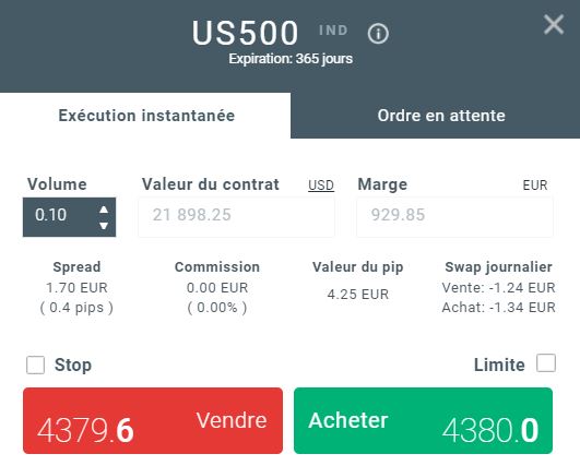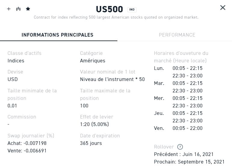 - US500 – contrat pour un indice composé des 500 plus grandes entreprises des États-Unis. Il est souvent considéré comme un baromètre de la performance globale du marché boursier. L'indice est une référence commune en ce qui concerne la performance des portefeuilles actifs.