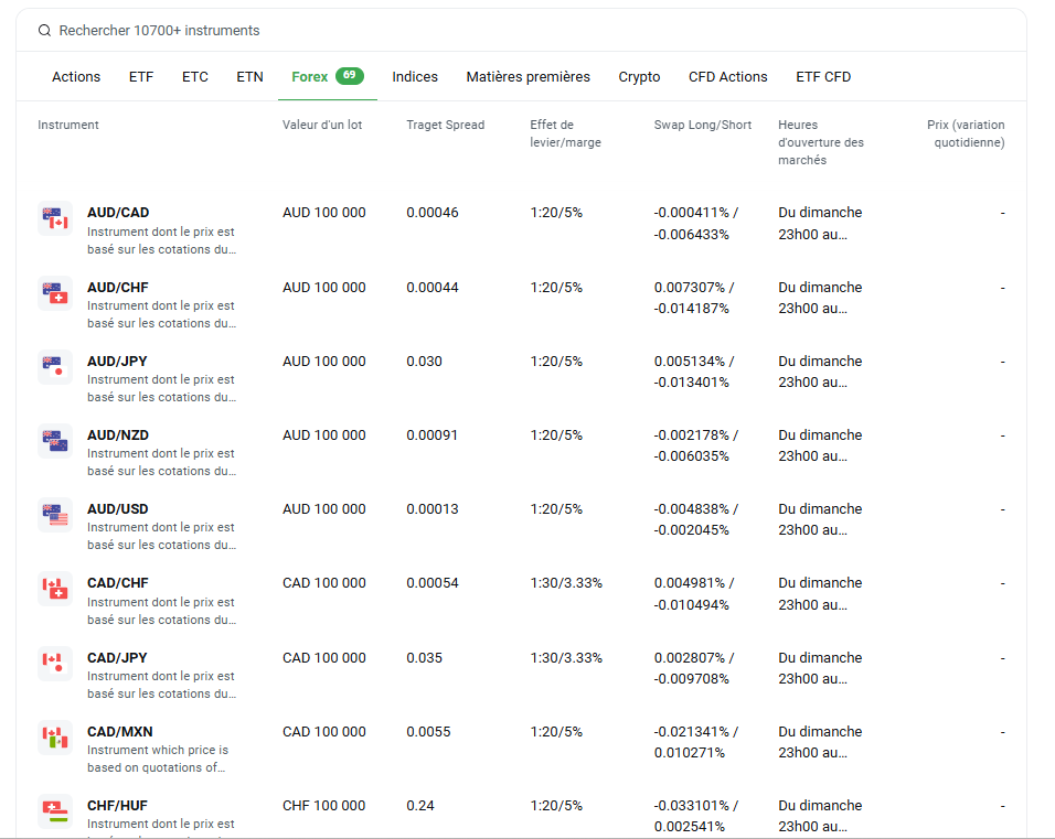 Swap/overnight : crédit ou débit journalier appliqué à 23 h CET si vous gardez la position ouverte ; ce coût dépend des taux interbancaires de chaque devise.