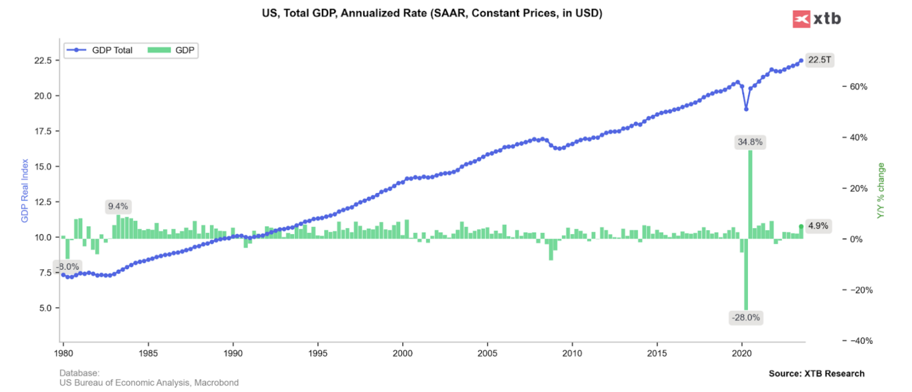 À long terme, le marché boursier est corrélé à la croissance économique. Comme nous pouvons le voir ci-dessus, le PIB américain progresse depuis les années 1980, à un rythme exceptionnel. Une économie forte signifie des consommateurs en bonne santé avec des revenus plus élevés - c'est un facteur positif pour les marges et les bénéfices des entreprises. Malgré cela, en raison de la cyclicité et des événements imprévisibles, il arrive que les actions sous-performent et que les sentiments économiques soient très bas. Source : XTB Research
