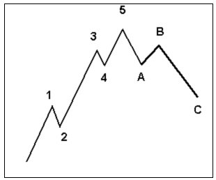 Cela crée un modèle à cinq ondes : impulsion, correction, impulsion, correction et une autre impulsion. Ces cinq vagues sont étiquetées respectivement de la première à la cinquième vague. La tendance haussière est alors suivie par trois vagues baissières : une impulsion vers le bas, une correction vers le haut, puis une autre impulsion vers le bas. Ces ondes sont étiquetées A, B et C.