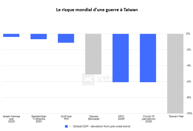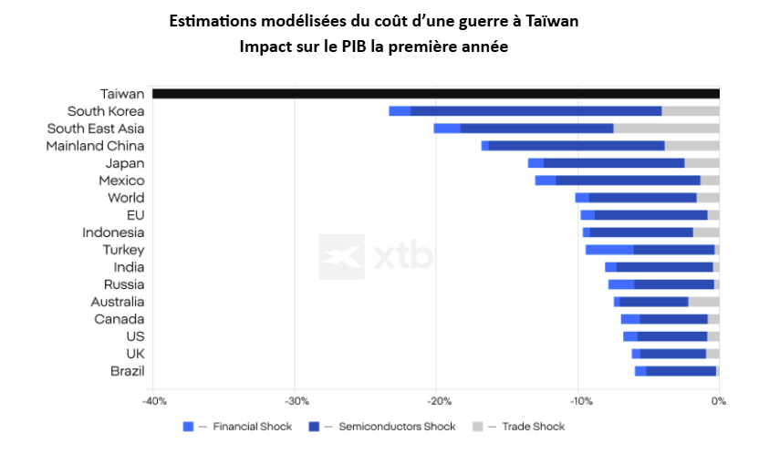 Selon les analystes de Bloomberg Intelligence, une guerre avec Taïwan provoquerait le plus grand choc commercial en Corée du Sud, en Asie du Sud-Est, en Chine continentale, au Mexique et à Taïwan bien sûr, et aboutirait à une baisse de 10 % du PIB mondial. Toutefois, il est important de noter que les implications à court et à long terme de ce scénario sont difficiles à prédire car de nombreux événements imprévisibles peuvent se produire.