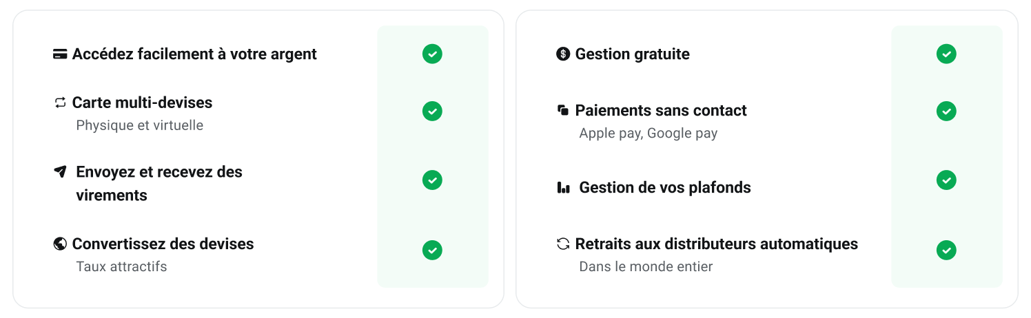 La gestion gratuite du compte, l’absence de frais cachés et les taux de change du marché permettent de réaliser des économies par rapport aux services bancaires traditionnels.