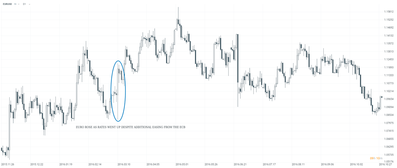 Mais ce n'est pas aussi simple que cela est montré dans notre exemple. Regardons maintenant la banque centrale européenne. En mars 2016, la banque centrale a dû prolonger ses mesures d'assouplissement à mesure que les perspectives d'inflation se détérioraient davantage. La banque centrale devait réduire ses taux et étendre son QE, ce qui s'est effectivement produit. Cependant, l'euro a monté en flèche à la suite de la décision, comme le montre le graphique ci-dessous. Pourquoi? Tout le monde s'attendait à des mesures d'assouplissement supplémentaires, de sorte que leur introduction n'a pas été une grande surprise pour les marchés. Mais la banque centrale a fait quelque chose que personne n'attendait. Il a dit que c'était la fin du cycle d'assouplissement, du moins pour l'instant. Cela a conduit à une forte hausse des taux, ce qui s'est traduit par un euro plus fort. Les traders essaient toujours d'être plus rapides que le marché, plus vite que tout le monde, alors quand la BCE a signalé que c'était la fin du cycle d'assouplissement, elle les a forcés à penser à un resserrement potentiel dans le futur.